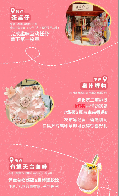 与此同时,华硕a豆还以“香”为线索,围绕茶桌仔、泉州鲤物、有鲤天台咖啡等三大泉州西街特色地标,开启“豆叮的寻香之旅”集章打卡活动,完成指定任务即可解锁限定好礼,在红砖古厝和烟火交织的泉州街头,邀你感受华硕a豆14 Air 香氛版的独特魅力。